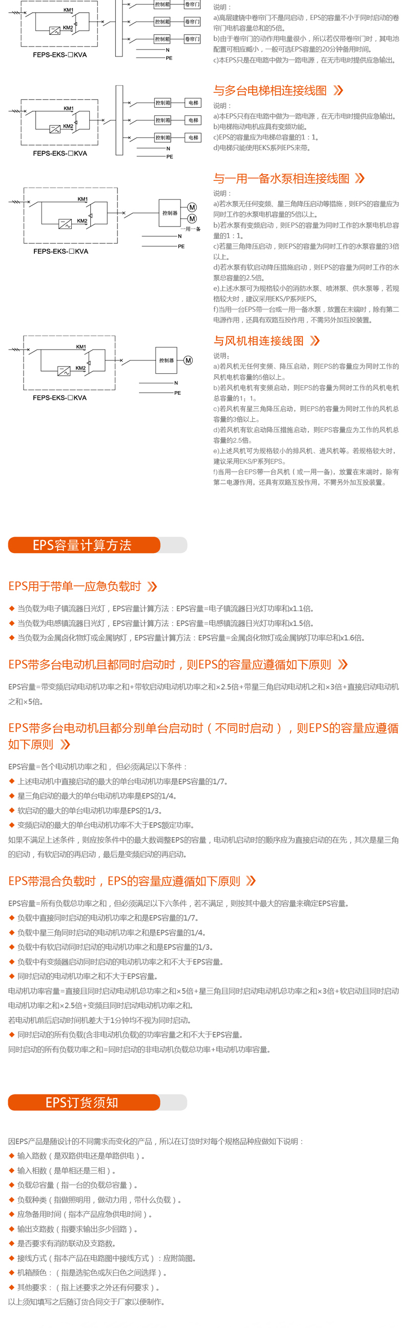1、若電機均有變頻啟動功能,則各負載容量總和與EPS容量的選配比為1:1