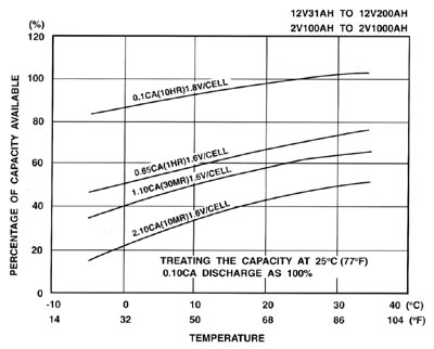 溫度對電池容量有顯著的影響,溫度降低,電池容量下降,請參考曲線圖。 |